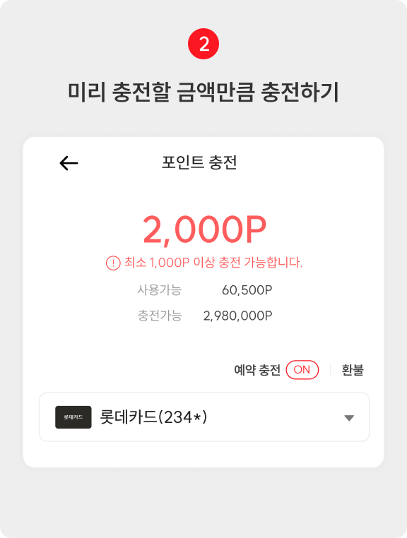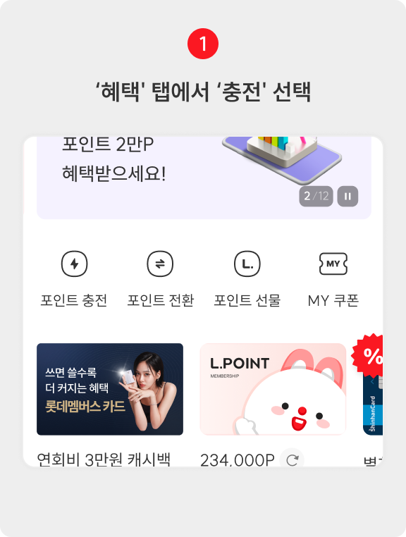- 타 충전/충전결제 혜택(ex. [엘포인트 APP전용 혜택] 충전 결제 3% 적립 프로모션 이벤트, 2026 LUCKY NEW YEAR 롯데리조트, 롯데스카이힐CC 단독 충전결제 7% 혜택 등)과 혜택이 중복 적용되지 않습니다.